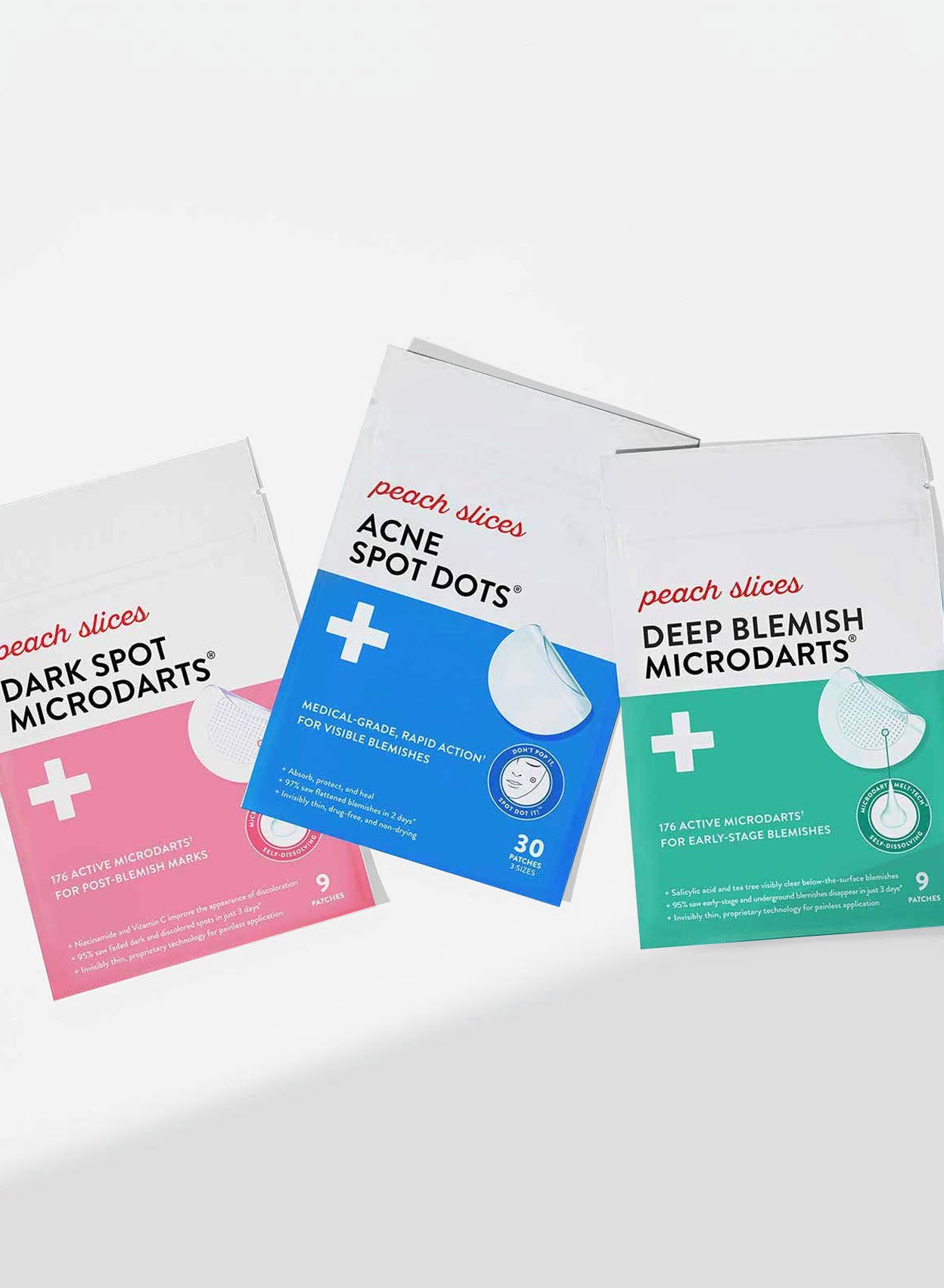 Ready for any zituation? This trio covers all your blemish bases. Deep Blemish Microdarts target early-stage pimples and Acne Spot Dots gently absorb gunk once they pop up. Then, Dark Spot Microdarts visibly fade post-blemish marks and hyperpigmentation. Each translucent patch can be worn under makeup or on bare skin.